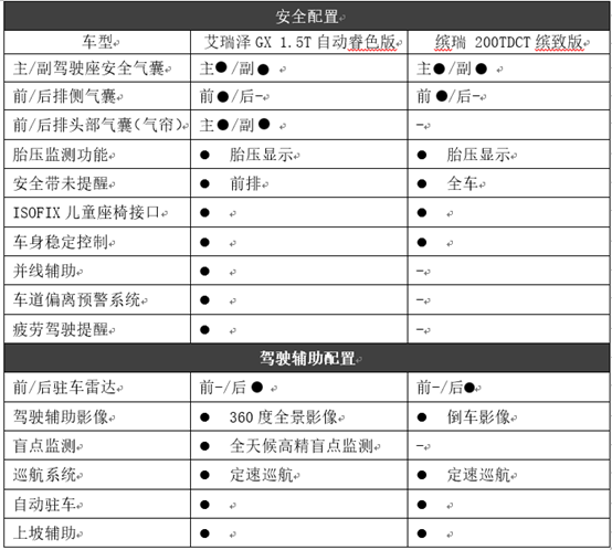 关于车辆安全防护和行车辅助配置,从表格不难看出,艾瑞泽GX比缤瑞更为全面些。主/副驾驶座安全气囊、侧安全气囊、胎压监测装置等都一应俱全,并且艾瑞泽GX还比缤瑞多了前/后排头部气囊(气帘)、并线辅助、车道偏离预警、疲劳驾驶提醒、盲点监测,能让用户的行车更安全、更轻松。