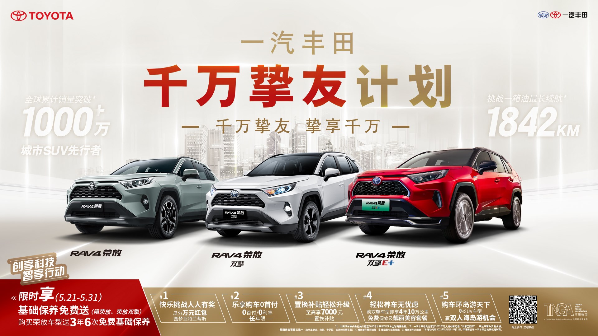 与全新亚洲龙同出自TNGA-K平台的RAV4荣放,同样关注度颇高。在5月21日-31日,“限时享”火热启动,用户购买RAV4荣放、RAV4荣放双擎,即可获得价值3500元的3年6次免费基础保养,相当于3年0成本养护爱车。此外,大家参与一汽丰田双擎家族24小时世界纪录挑战赛,就有机会圆梦亚特兰蒂斯,购买包括RAV4在内的其他SUV车型,还可赢取3天2夜双人海岛游。更详细的政策信息,大家可咨询一汽丰田当地经销商。