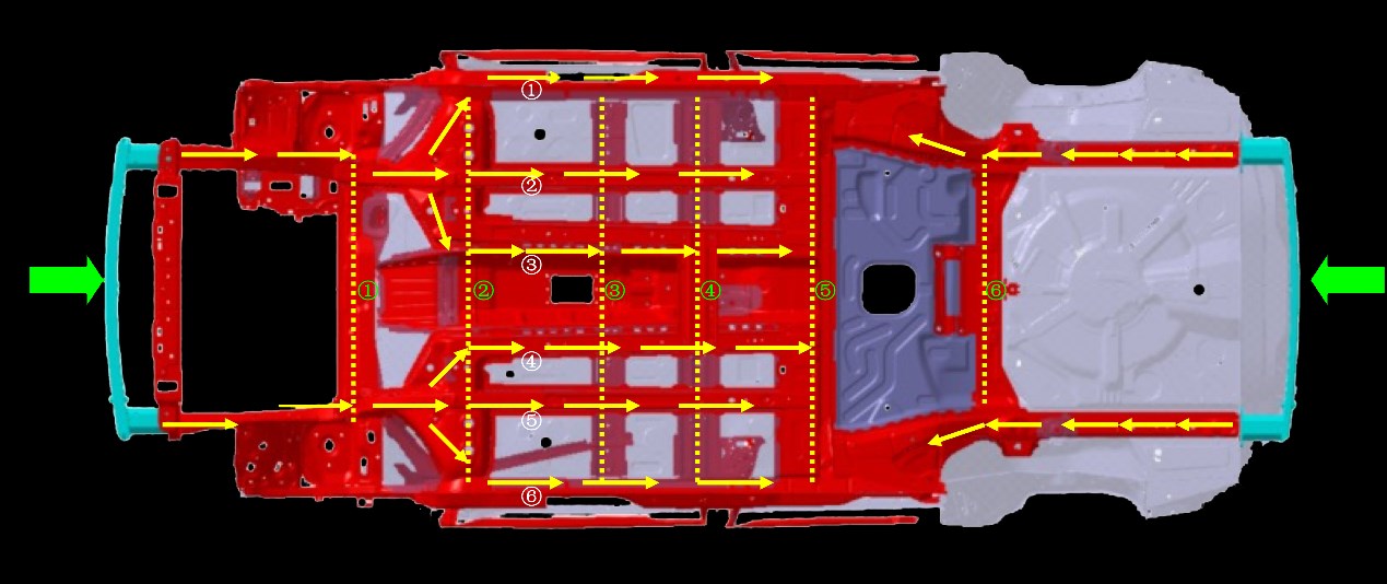 (新408车身地板设计了6道纵向及6道横向加强梁)