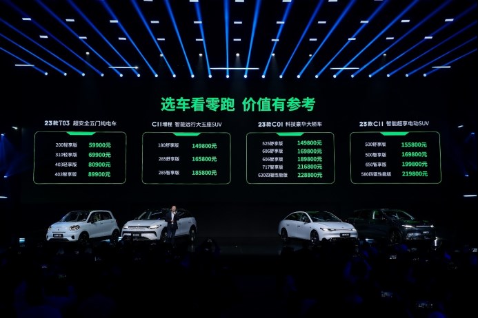 发布会上,零跑C11增程和2023款C01、C11EV、T03重磅发布,零跑科技创始人、董事长朱江明现场揭晓售价,其中C11增程售价14.98-18.58万元, 2023款C01售价14.98-22.88万元,2023款C11EV售价15.58-21.98万元,2023款T03售价5.99-8.99万元,做到让消费者用更少的钱,买更好的产品。