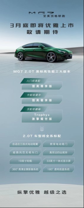 3月10日,MG黑标首款旗舰轿跑MG7 2.0T车型配置正式公布。三款车型在搭载2.0T 9AT全新一代上汽蓝芯高性能黑标动力组合基础上,均标配自适应三段式电动尾翼、超跑风范无框车门、掀背电动尾门、双边四出尾排等十多项高端配备,Trophy 激擎耀世版更有E-LSD电子限滑差速器、mCDC智能可调电控悬架等同级唯一的高阶配置,由内而外完美诠释优雅式运动,堪称“极速卷王”。新车将于3月底重磅上市。