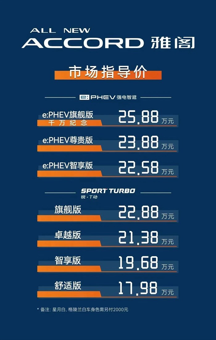 全新雅阁(ALL NEW ACCORD)是Honda尖端技术集大成者,开发团队怀着“我们要造一台好车”的强烈信念,以“Driven by My ACCORD搭档雅阁,共驱高处”为开发理念,打造出一台让驾驶者萌生“这就是我想要”的车。新车拥有锐·T动和e:PHEV双动力,集“智动、智座、智驾”于一身,将成为真正的新电动化科技品,全维重构出行体验。