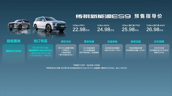 10月1日,传祺智电新能源E系列的第二款产品——传祺ES9正式开启全国预售。新车共推出4款配置,预售价格区间为22.98万元-26.98万元。预售期间,广汽传祺还推出7项预售权益,从置换、交车、用车、售后服务上为用户带来全方位考虑,不仅享2万元置换补贴,在传祺ES9上市前(含上市日),预订用户通过官方APP/小程序参与“ES9超级充电站”预售活动,还可在车辆交付的时候获得定制华为 Mate 60 Pro,以超出期待的福利给用户送上国庆大礼!
