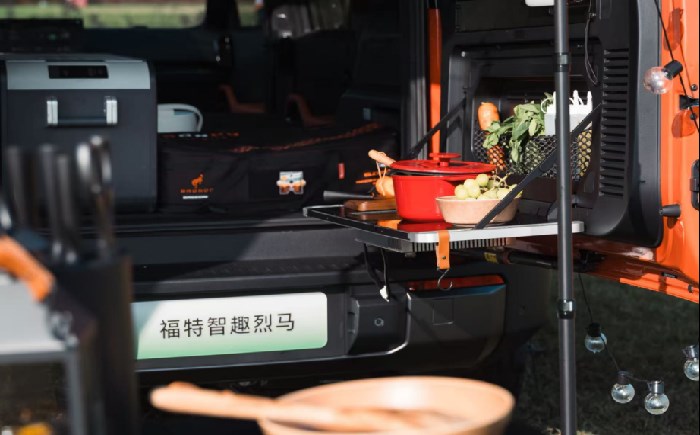 针对这一痛点,福特智趣烈马为用户提供户外烹饪的解决方案。为了打造移动“山野厨房”,福特智趣烈马在尾门集成了“切配 + 烹饪”双分区承重桌板。桌板可承重18kg,一边可以切配菜品,另一边可嵌入电磁炉实现烹煮功能。新车搭配同级最强的6.6kW外放电功能,因此“厨房”可支持电磁炉、电水壶、咖啡机等多台大功率电器同时工作。