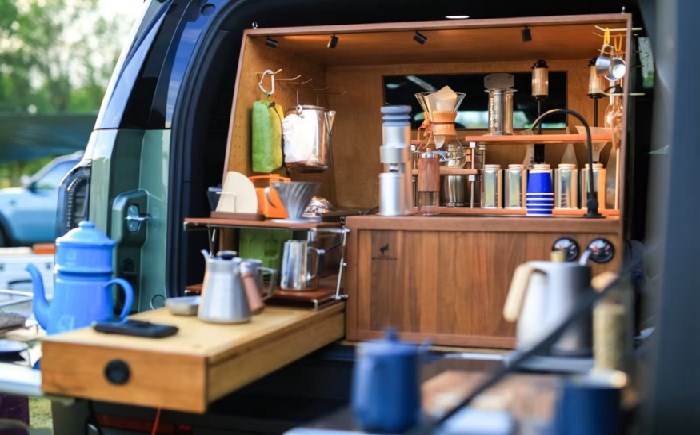 此外“山野厨房”的收纳也特别简便:侧开尾门可选装磁吸件、内嵌式电磁炉的,原厂定制收纳包和后备箱严丝合缝,做到刀具、调料瓶、电磁炉等厨具区隔放置,拿取时一目了然;尾门还有原厂预置的置物网格,可放入备好的食材,直接拿取。