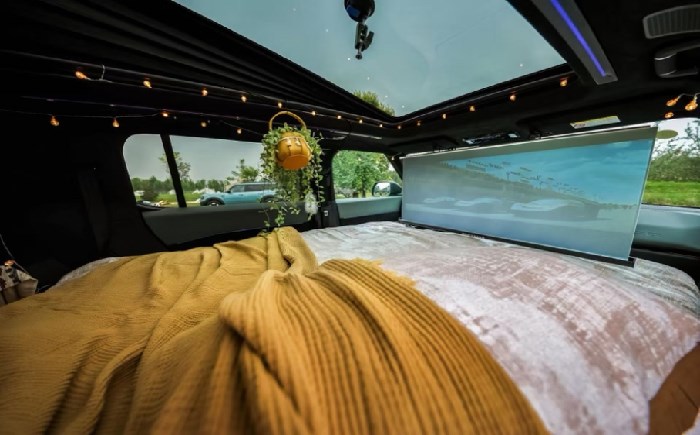 福特智趣烈马打造的“恒温安心露营空间”解决方案完美解决了以上痛点。它可以实现一/二排座椅一键电动放平,形成2米大床,且完全不占用后备箱储物空间,无需挪动后备箱行李。在成床状态下,车内阅读灯支持亮度与色温的无级调节,用户还可设置轻柔的“光闹钟”唤醒功能。座舱内的出风口与充电口分别巧妙布置于B柱和C柱,特制床垫亦不遮挡冰箱开口,确保成床后空调、充电、冰箱等功能仍可正常运行,实现“有温感,无风感”的舒适体验。