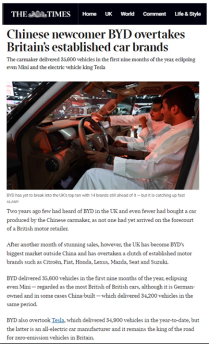 3:《泰晤士报》:中国新晋品牌比亚迪超越英国老牌汽车品牌