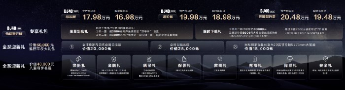 自此,BJ40增程家族一共拥有标准版、进阶版、元境智行版三个版型。北京越野还带来了BJ40增程三个版型均能享受的两大全系迎新礼。