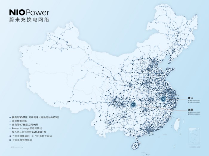 自2018年5月20日第一座换电站投入运营以来,截至2025年11月14日,蔚来在全国范围已累计提供换电服务超过9000+万次,换电站累计布局数量已达3,567座,其中高速公路换电站1,003座,超充站数量达4,788座,充电桩27,391根,接入第三方充电桩1,434,000+根,为用户提供可充可换可升级的能源服务体验,让加电比加油更方便。
