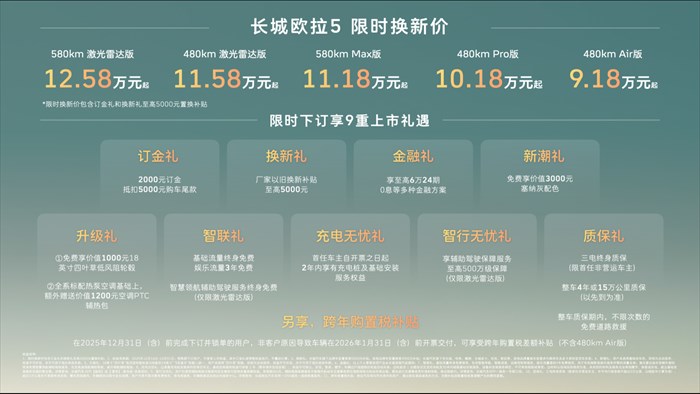 【中国·保定】2025年12月16日——今日,长城汽车欧拉品牌全新A级纯电SUV——长城欧拉5正式上市。新车共推出5款配置,建议零售价区间为 9.98万至13.38万元,限时换新价9.18万元起(限时换新价包含“订金礼”和“换新礼”至高5000元以旧换新补贴)。为回馈广大用户的热爱与支持,即日起至2025年12月31日,用户下订并锁单即可尊享包含订金礼、换新礼、智行无忧礼在内的9重上市好礼,以及跨年购置税补贴(不含480km Air版)等丰厚购车权益。凭借诚意十足的价格权益与越级产品力,长城欧拉5致力于成为全球年轻用户的“严选搭子”。