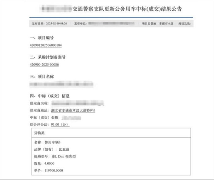 在全国多地政府的实际采购中,比亚迪已成为警车队伍中的“高频面孔”。公开的政府采购公告显示,安徽合肥、辽宁锦州、陕西西安、湖北孝感,再到贵州黔南,多地公安系统的警车采购项目中都出现了比亚迪旗下车型的身影。这些车型覆盖了秦PLUS、宋Pro、宋PLUS等多款主力产品,应用于日常巡逻、刑事侦查等多种执法执勤场景。
