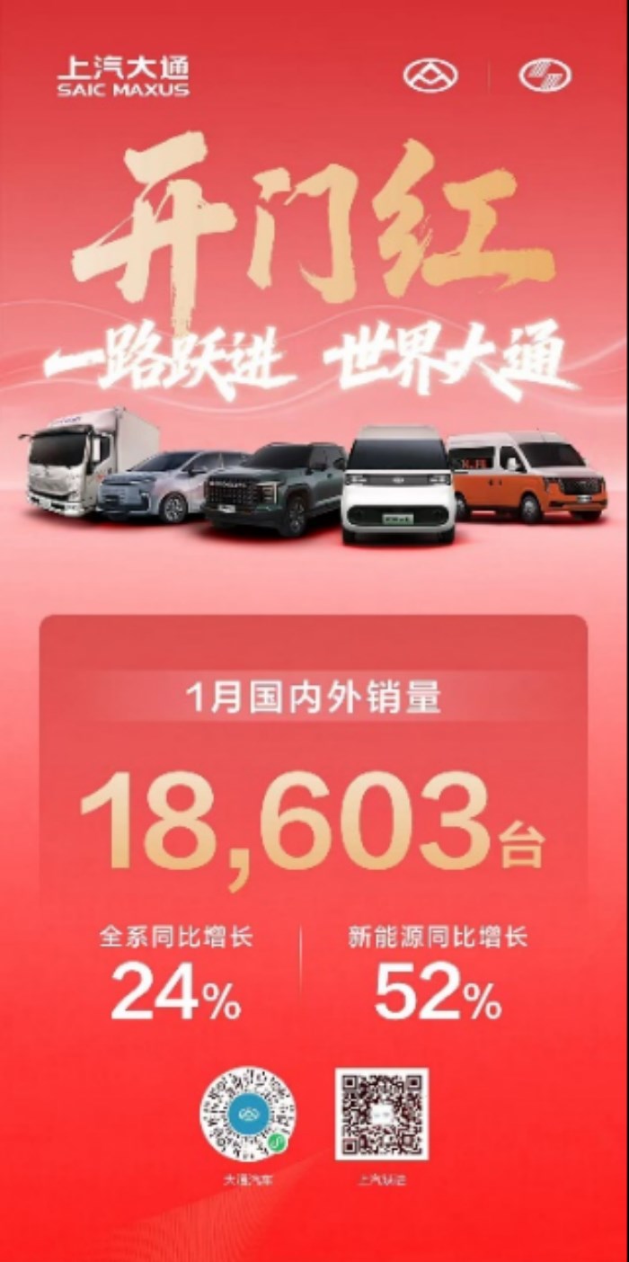 2026年开新局,上汽商用车旗下多品牌协同发力,以“开门红”奠定全年高质量增长基调。1月,上汽商用车热销20,440辆,同比增长21%,新能源车销量同比增长54%。其中国内热销11,067辆,同比增长28%,海外热销9,373辆,同比增长14%。新能源转型与全球化拓展成效显著,进一步巩固了在商用车行业的领先地位。