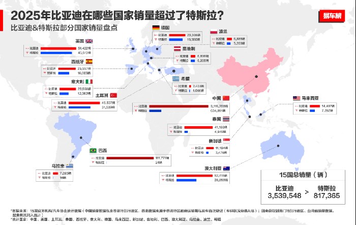 这一系统性优势在全球核心市场得到了充分验证。在欧洲,比亚迪实现了从单一产品切入到体系化突破的转变。其在英国市场销量超过5万辆,同比激增485%;在德国、西班牙、意大利等传统汽车强国,年销量均突破2万辆。这一成绩不仅源于产品矩阵的完善与设计品质的认可,更得益于其销售与服务网络的快速本土化铺设。在亚太等增长型市场,比亚迪的领先优势更为显著:在土耳其、泰国,其年销量分别达到4.5万与4.1万辆,泰国本地化工厂的投产大幅增强了市场主导力;在新加坡、马来西亚等市场,其销量已达特斯拉的2-3倍。在南美的巴西,比亚迪年销超11万辆,成为2025年巴西市场电动汽车销量最高的制造商。澳洲表现同样不俗,25年比亚迪在澳大利亚年销超过5万辆,跻身品牌榜前十。这些表明,比亚迪的竞争力已能适应并引领不同发展阶段市场的需求。