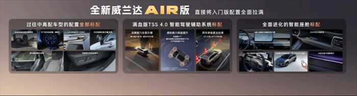 更打破行业惯例的是,全新换代威兰达AIR版不以“低价=低配”为潜规则,反而做到了“入门配置拉满”。以往中高配车型专属的真皮方向盘、高级皮质座椅、外后视镜折叠加热、50W无线快充、64色氛围灯等舒适配置,以及全面进化的智能座舱和油车里最好用的L2级丰田TSS 4.0智能驾驶系统,均是标配。这意味着用户无需在预算和心仪配置之间艰难抉择,一步到位即可享受全方位的满配与科技体验,彻底告别“套路式选装”。
