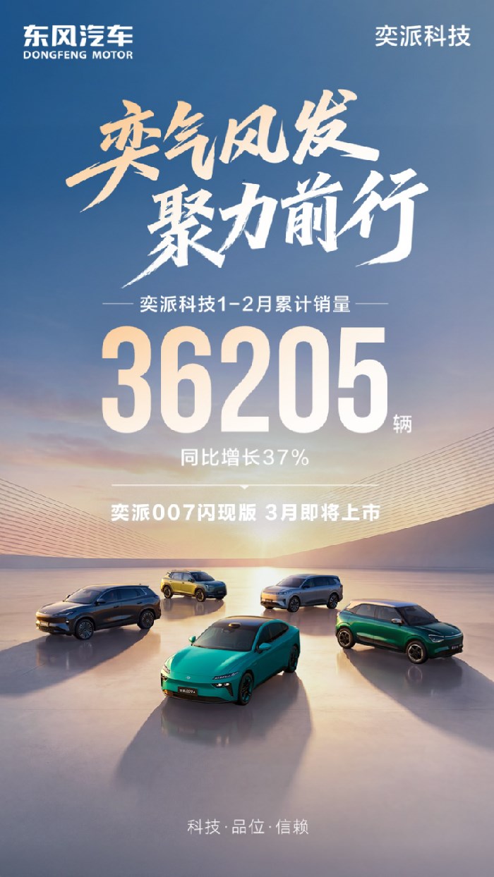 奕派科技逆势增长!3月1日公布的最新数据显示,奕派科技2月销量达14464台,保持同比增长;1-2 月累计销量36205台,同比增长37%,成功打赢新春第一仗。在行业整体下滑的形势下,奕派科技延续开门红势头,彰显强劲发展动能。乘势而上,奕派科技开启新一轮营销攻势,奕派007闪现版将在3月上市,其余多款新品也将陆续登场。