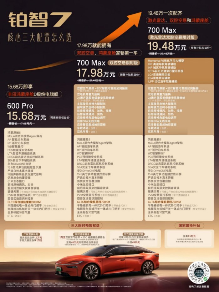 这份终极确定性,首先体现在极具诚意的价格与三大限时权益上。铂智7此次推出五大版本,以阶梯式配置组合覆盖不同用户的多元需求,每一款都在同价位段树立了全新的价值标杆。