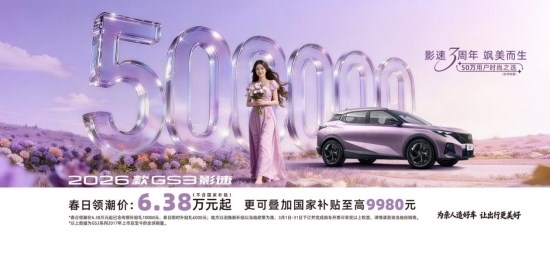 三载同行,初心不改,50万荣耀,逐光前行。传祺GS3影速以深耕铸就市场标杆,以过硬实力赢得用户信赖,以丰富配置适配女性需求。现在入手影速,仅需6.38万起,即可驾享生活的每种精彩。女神节&上市三周年之际,传祺GS3影速陪伴每一位独立女性,奔赴更广阔的星辰大海。
