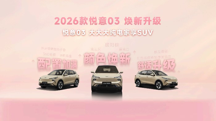 三月春暖,悦见花开。3月8日妇女节,实力演员张若昀直播助阵,“大大大纯电家享SUV”焕新而来,2026款悦意03挚爱上市,为每一位女神献上春天的礼物。445km、565km两种续航共计6款车型,官方售价7.98-11.99万元。围绕年轻小家庭,尤其是家庭女性用户的进阶需求,从颜色推新到舒适满配,2026款悦意03带来全新晨晖金车色、晨曦白内饰色等20余项升级,让用车更舒心、开车更省心、养车更安心,正如张若昀所说:“悦意03是真舒适的纯电SUV。”当前购车还可享7年0息贷款、无门槛整车及三电终身质保等丰富权益,轻松开启高品质纯电生活。