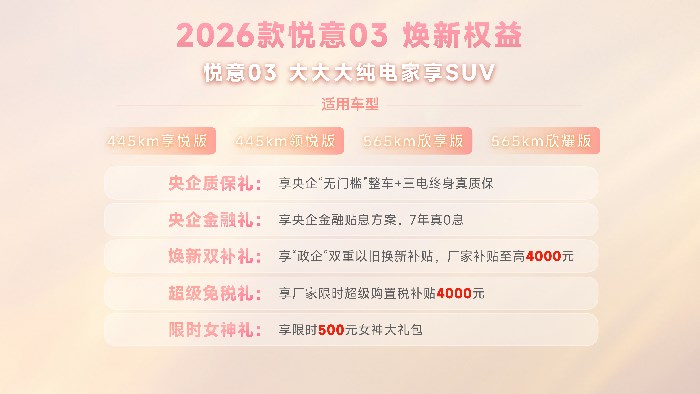 为了让更多家庭轻松拥有这份“悦意”,2026款悦意03还重磅推出央企五重礼遇。购车即享央企质保礼,“无门槛”整车及三电终身质保真诚以待,更有7年真0息央企金融礼,极大降低拥车门槛,同时,新车叠加焕新双补礼,政企双重以旧换新补贴至高4000元,以及限时4000元购置税补贴的超级免税礼、限时500元的开学/开工礼。特别值得一提的是,还有限时半价权益,可升级价值4000元的舒适选装包(具体优惠政策请详询当地经销商)。在这个女神节,让爱与梦想零负担启程。