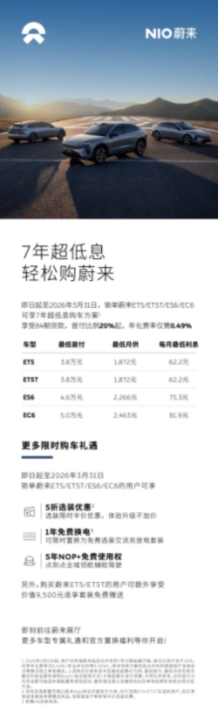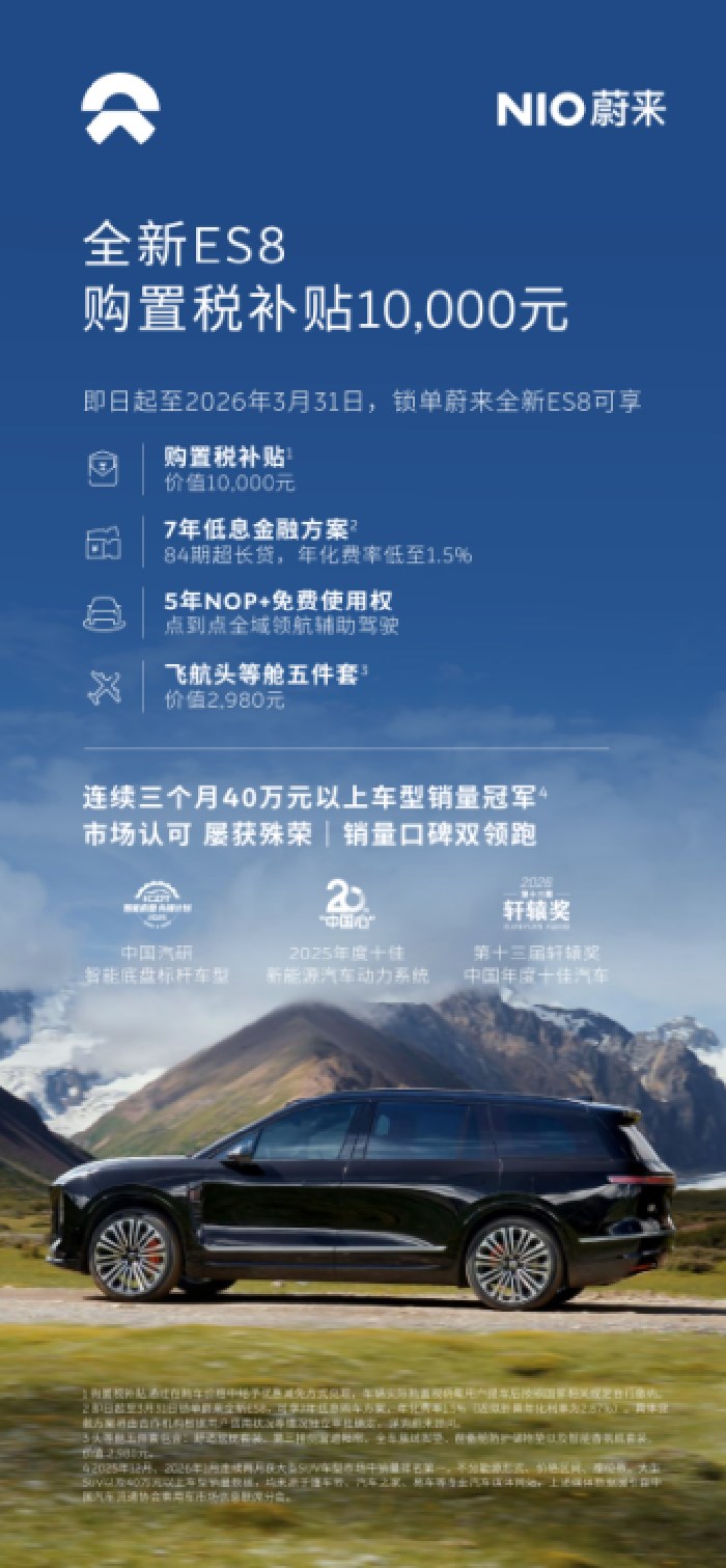 •7年超低息,轻松购蔚来,现在买全新ES8,享购车税补贴10000元,更有限时购车礼遇!