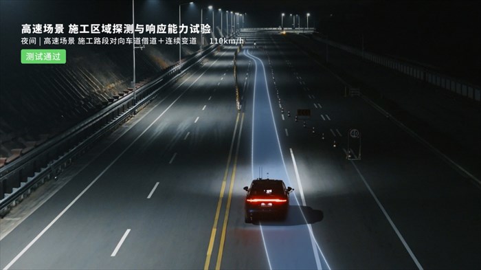 高速施工区域,夜间110km/h稳定通行:高速通勤场景下,华境S在施工区域专项测试表现亮眼。夜间施工路段,华境S能够在低光照环境下精准识别交通锥、防撞桶、隔离墩等低反光障碍物,并以 110km/h 车速稳定避让变道通行。测试继续加码,当多种障碍物组合成连续施工区域,华境S依然能够以 110km/h 车速精准识别障碍物后借道对向车道+连续变道通行,充分展现出其在夜间极端工况下卓越的全场景环境理解与通行能力。