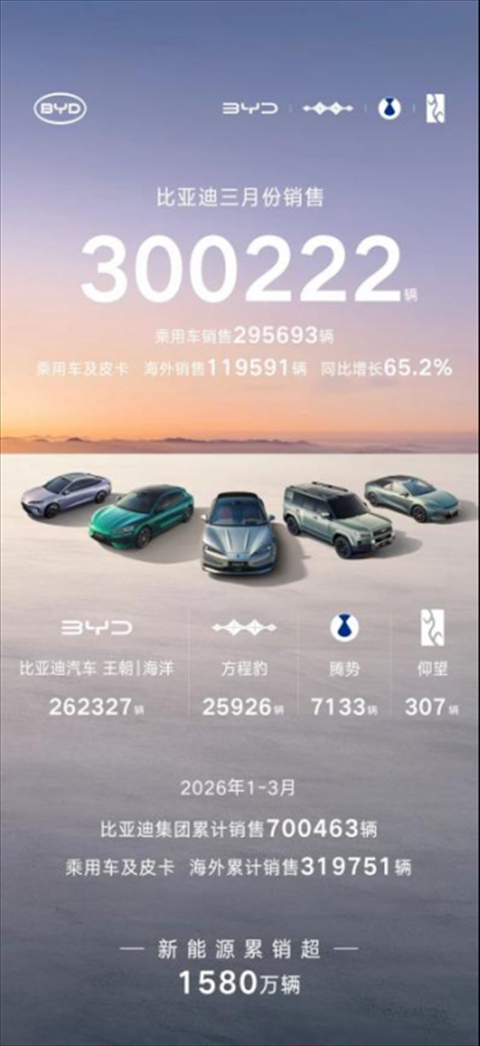 这不是某个新势力的虚张声势,而是比亚迪实实在在的重磅炸弹。据比亚迪官方公布,2026年3月比亚迪单月销量突破30万辆大关达到300222辆,一举拿下中国车企销量冠军宝座。58个月连续霸榜新能源汽车销冠,一季度累计销量70万辆——这三个数字摆在一起,足以让所有从业者重新审视这个行业。