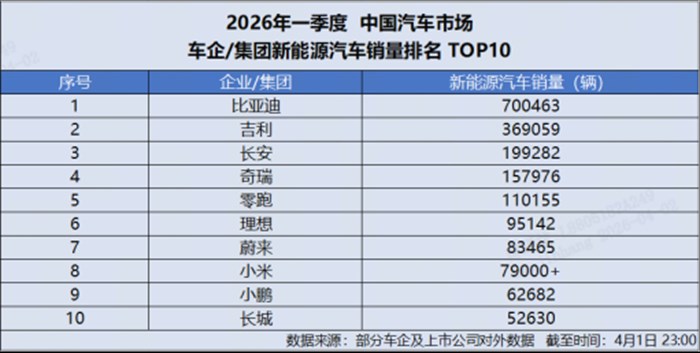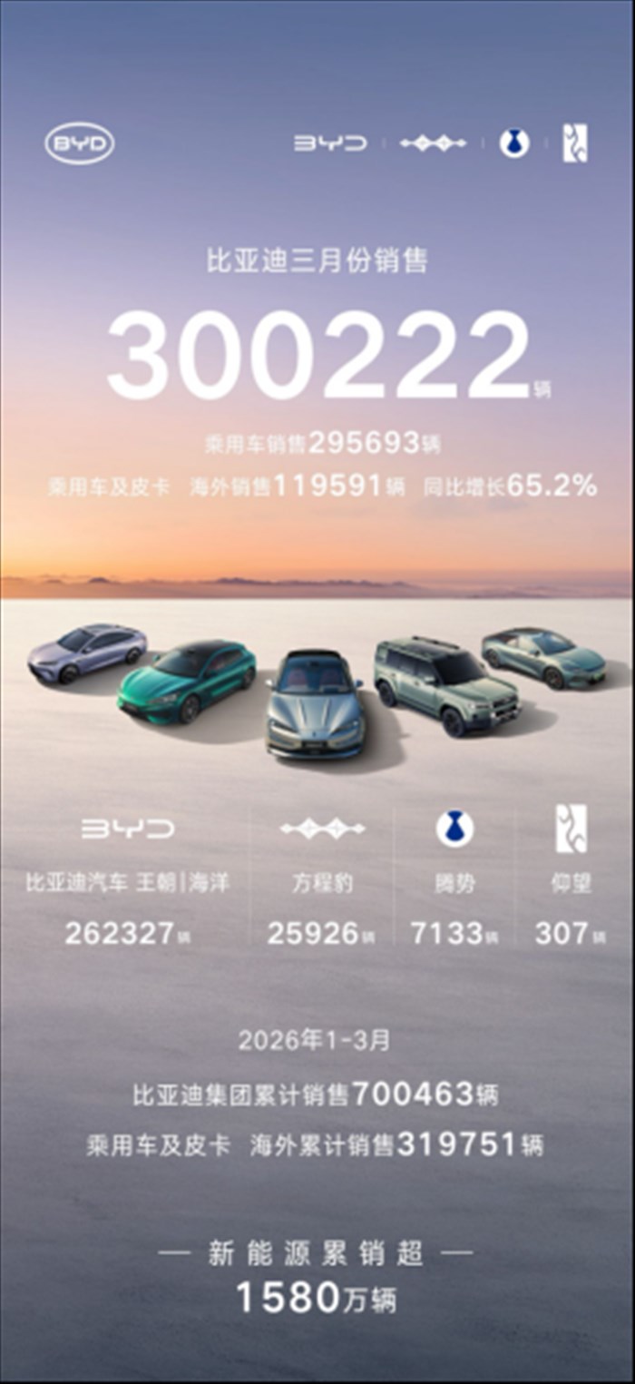4 月 1 日,比亚迪发布 2026 年 3 月产销数据,单月总销量达300222 辆,强势突破 30 万辆大关,再添荣耀战绩,斩获中国车企销量冠军,并连续 58 个月蝉联中国新能源汽车销量冠军,持续稳固行业龙头地位。截至目前,比亚迪新能源汽车累计销量已超1580 万辆,一季度累计销售 700463 辆,以硬核数据印证技术与规模双重实力。