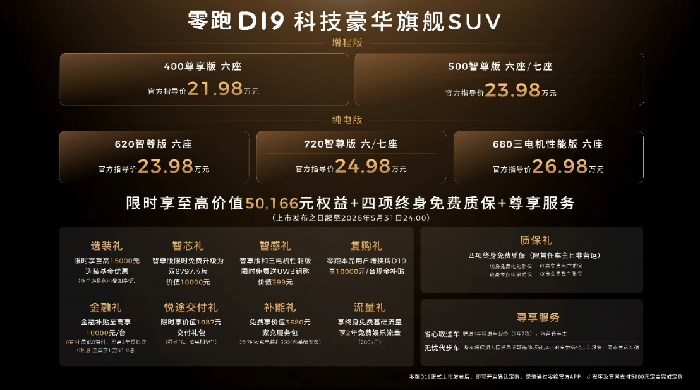 2026年4月16日,零跑旗舰D平台首款车型——零跑D19正式上市,售价21.98-26.98万元。新车定位“科技豪华旗舰SUV”,以旗舰级的美学、舒适、续航、智能、驾控、安全六大全维体验,彻底打破“旗舰即高价”的行业陈规,旨在重塑30万内全尺寸SUV的价值标杆,让真正的旗舰体验成为更多家庭的幸福之选。发布会现场,零跑D系列代言人费翔先生亲临助阵,零跑科技创始人、董事长、CEO朱江明先生为费翔交付首台零跑D19,双方共同见证这款旗舰车型正式上市,标志着零跑品牌向上与科技普惠迈入全新阶段。