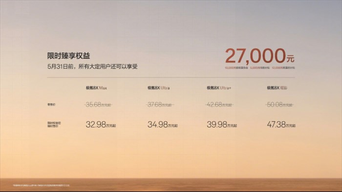 即日起至2026年5月31日24:00,定购极氪8X可享六重购车礼:「限时臻享权益」2.7万元现金直减;至高价值9.8万元的「豪华进阶礼」;以及8项「限时选装礼」等。用户可通过极氪App下定,或可前往极氪全国各门店试驾、品鉴,快速解锁高性能旗舰SUV的极致出行体验。