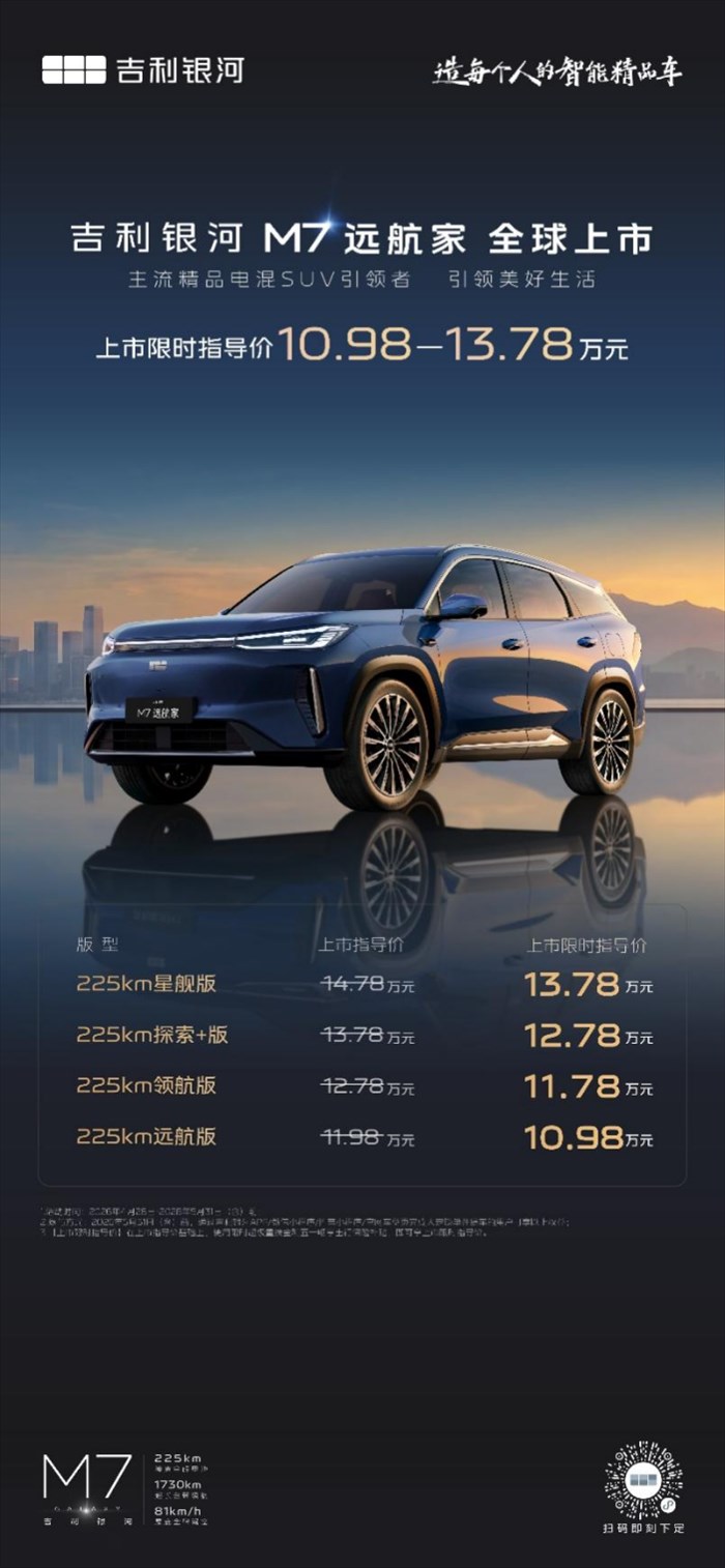 4月28日,“主流精品电混SUV引领者”吉利银河M7远航家正式上市,全系标配长续航225公里。新车共推出4个版型,分别是225km远航版、225km领航版、225km探索+版和225km星舰版,上市限时指导价为10.98万元-13.78万元。即日起,用户可通过吉利银河APP、微信小程序、抖音小程序及官网等官方渠道下定。2026年5月31日(含)前完成大定并提车的用户可享限时超级置换金、五一畅享出行保险补贴,以及上市限时八重权益:焕新礼、金融礼、升舱礼、智行礼、无忧礼、流量礼、交付礼、质保礼等多重福利